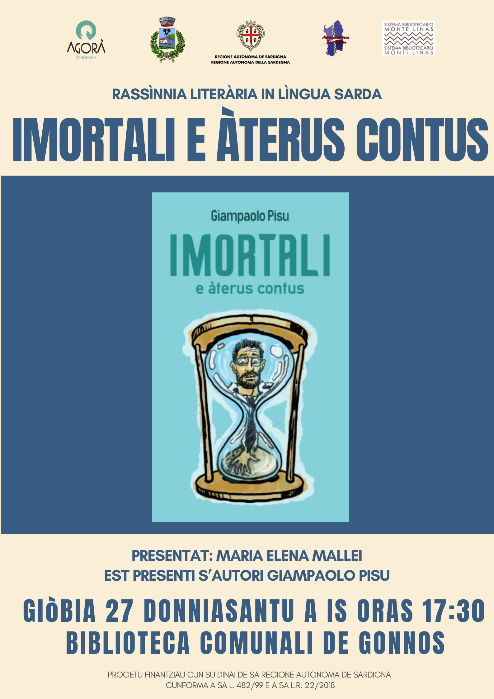 Giòbia, su 27 de donniasantu, in sa biblioteca Comunali de Gonnos, a is cìncui e mesu de merì, s’at a presentai su lìbburu Imortali e àterus contus. At a essi presenti s’autori Giampaolo Pisu. Presentat Maria Elena Mallei.